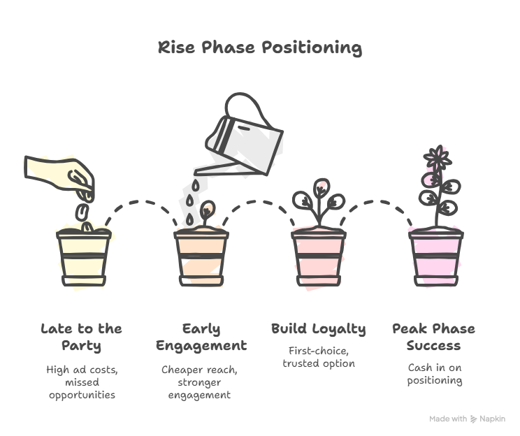 In the Rise phase, demand is still forming. People are not yet overwhelmed, which gives you three powerful advantages: